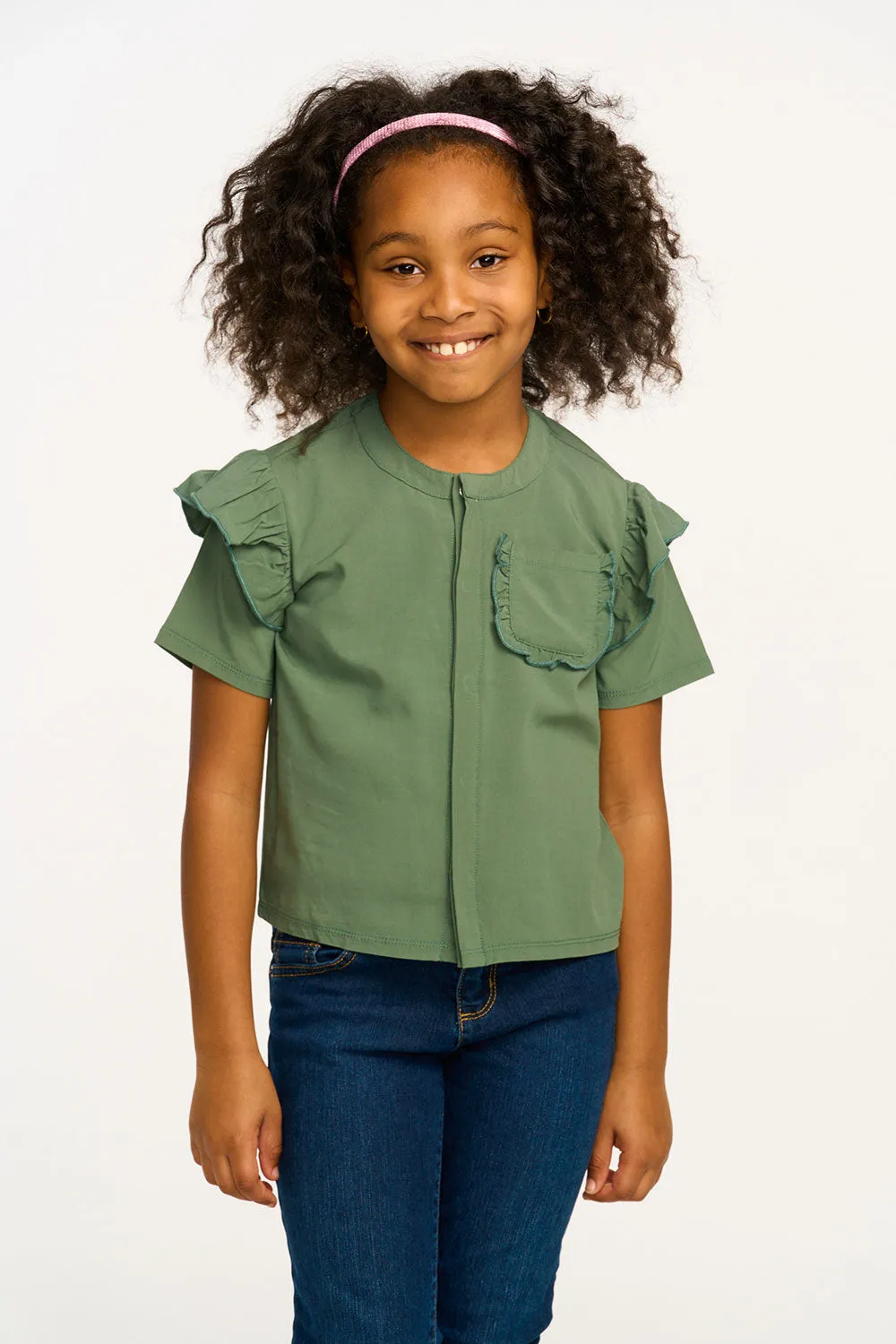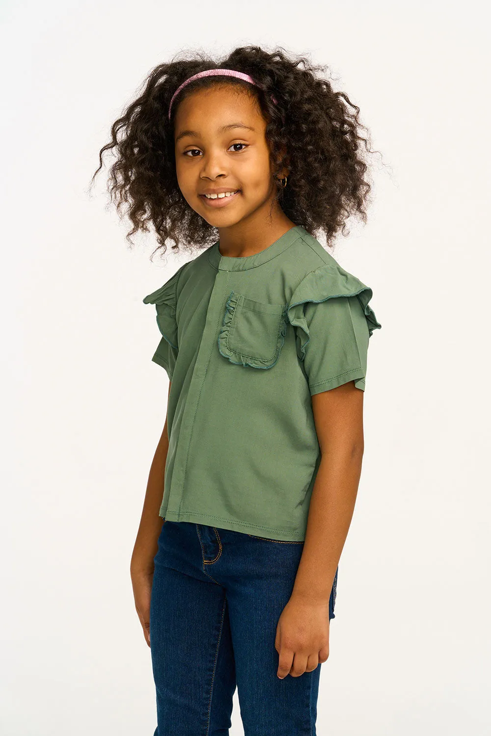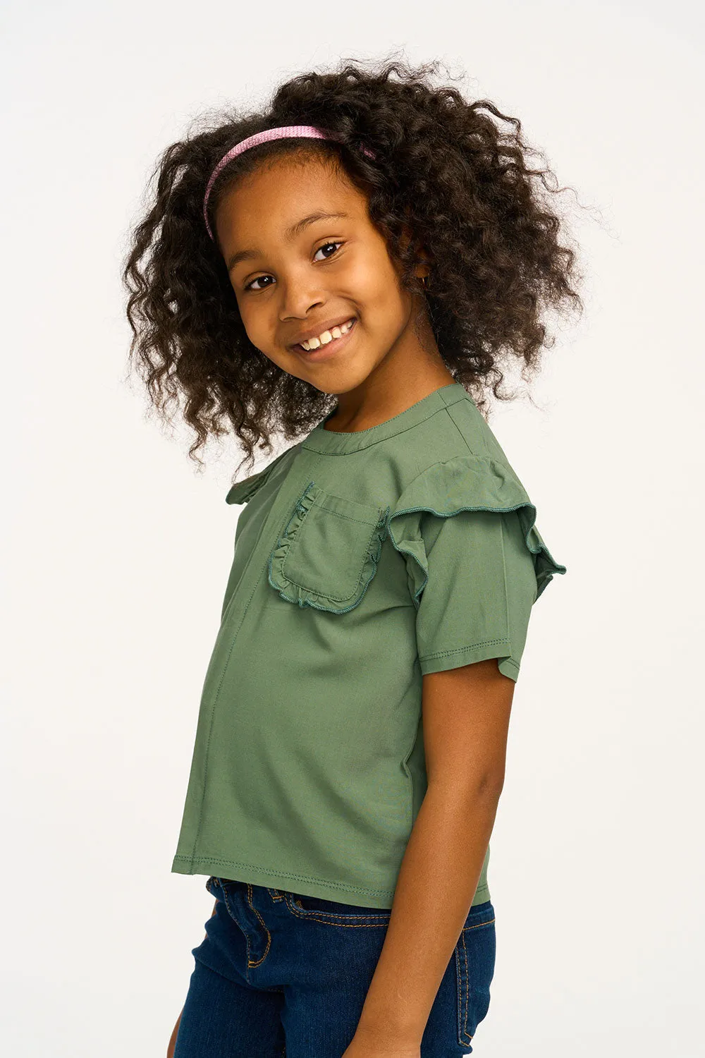 Classy ruffle details and a pocket-buttoned tee will make her feel like a million bucks!