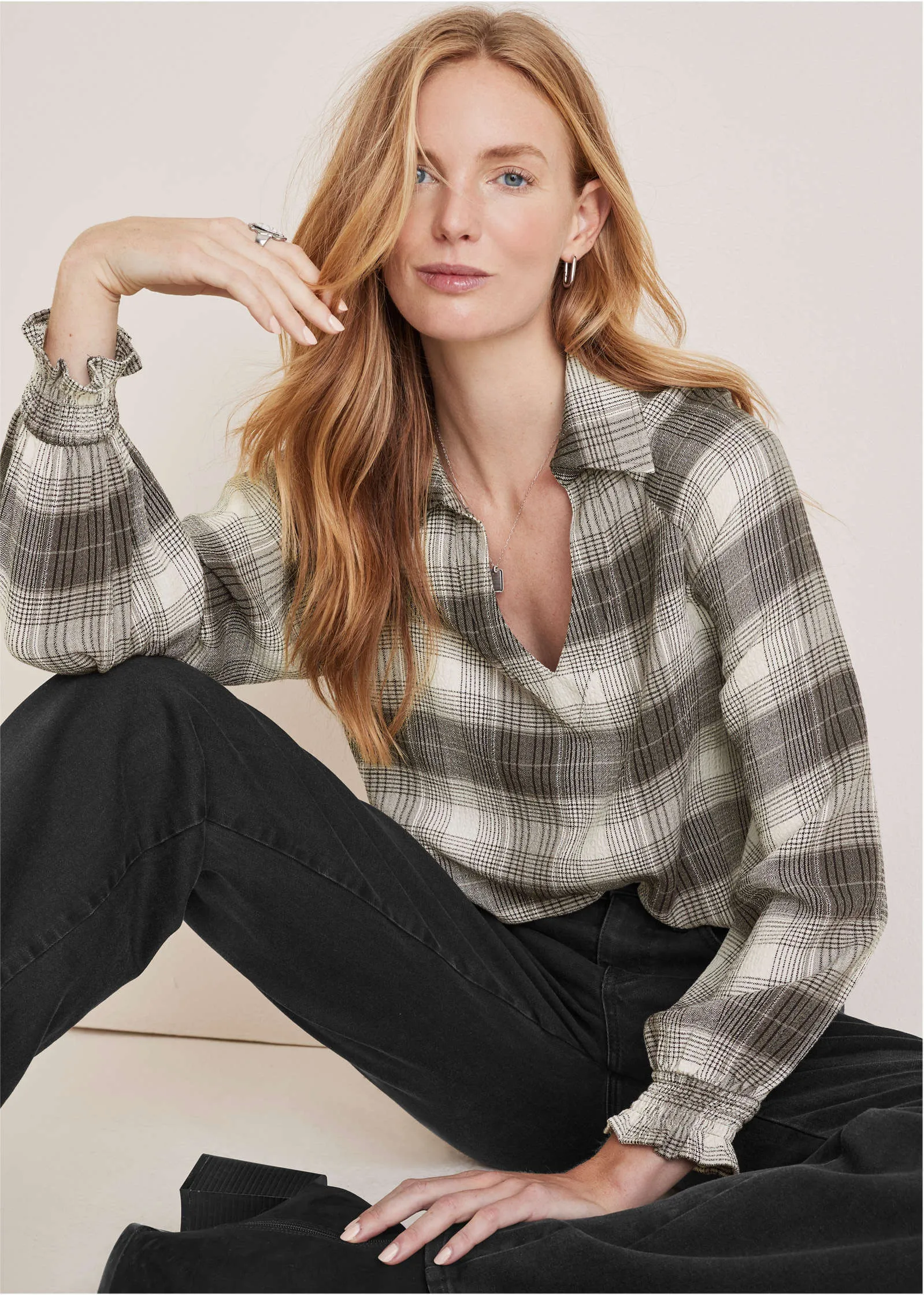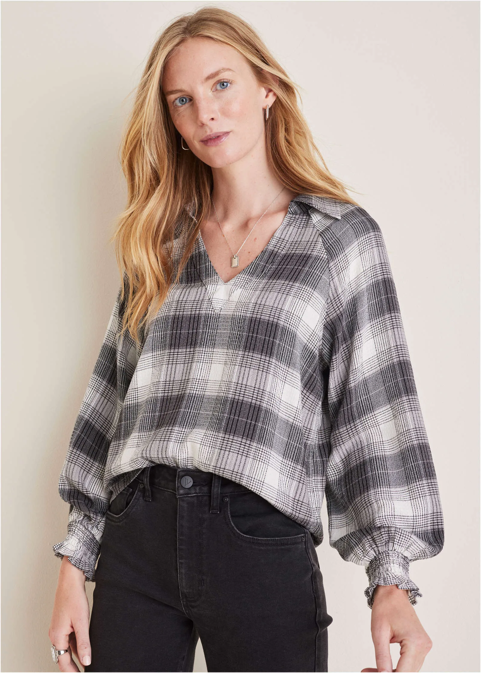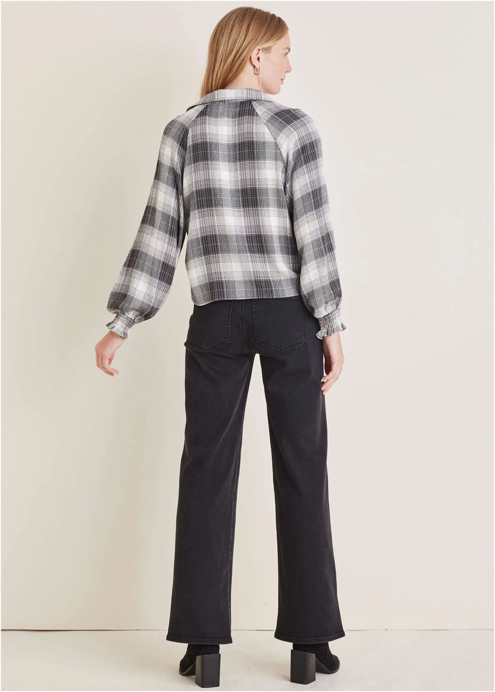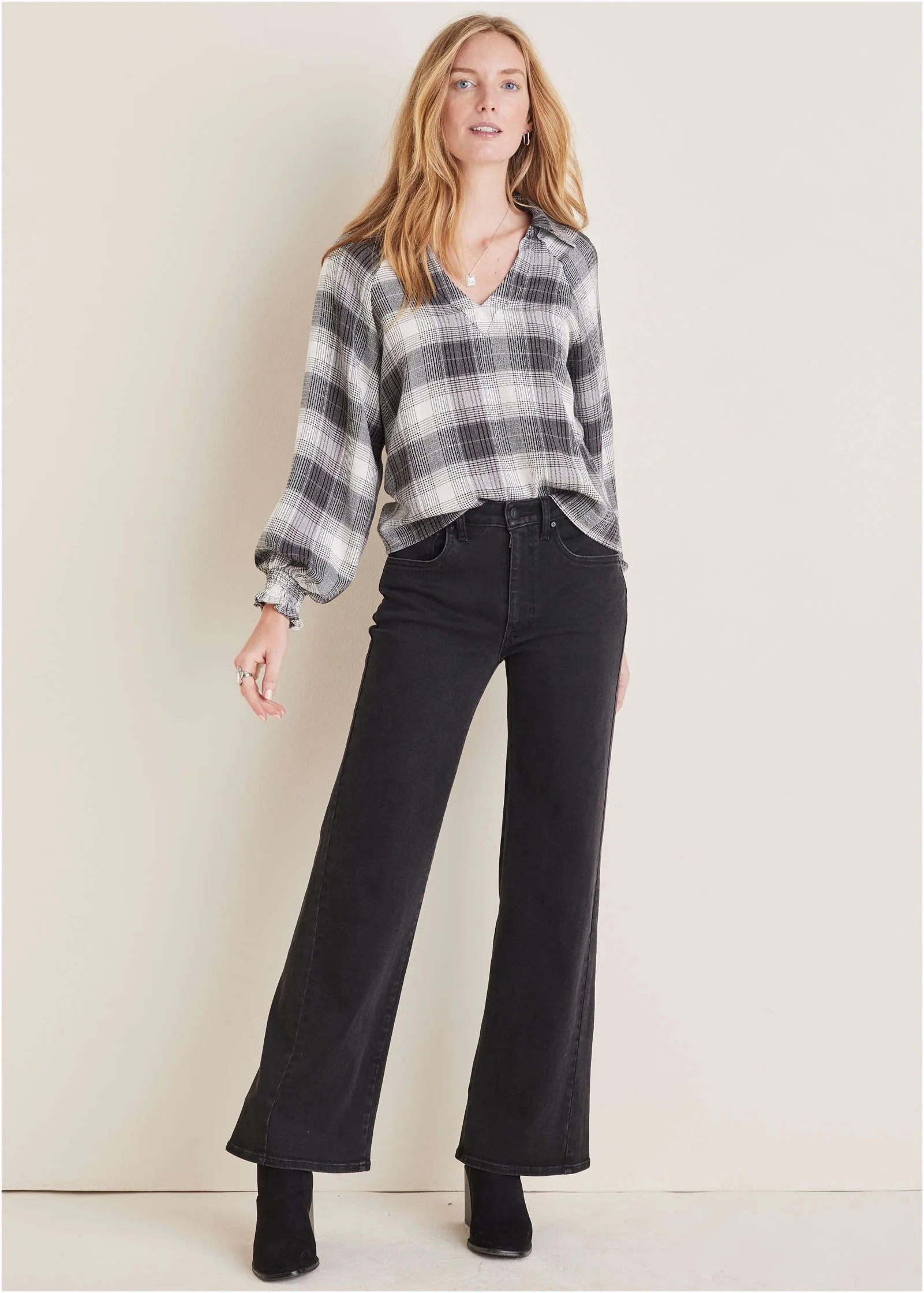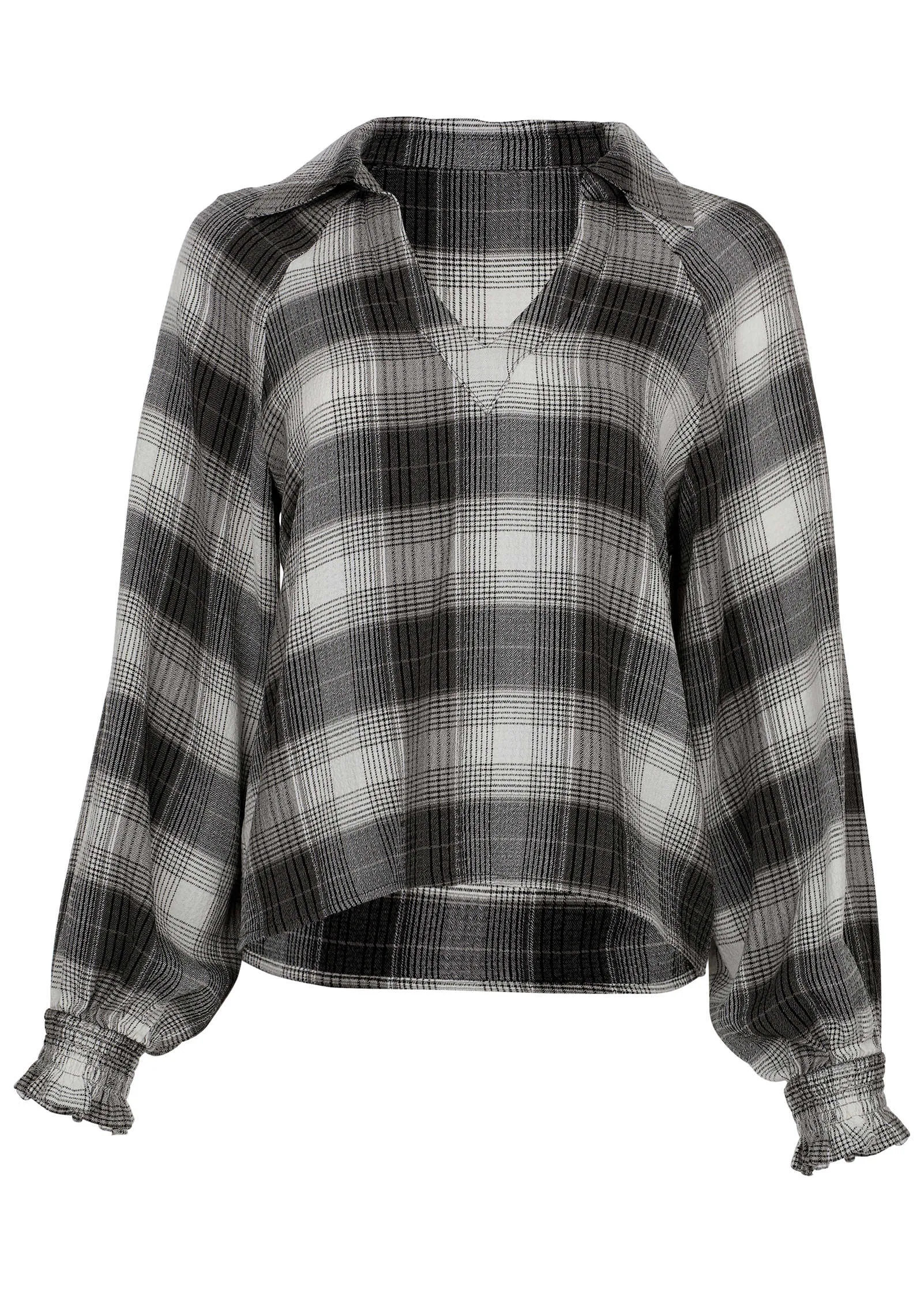 Plaid for fall? Groundbreaking! We put a new elevated spin on your favorite fall flannel. The soft, brushed plaid fabric offers cozy comfort that effortlessly transitions between seasons. With a loose silhouette and flowy sleeves, you get the comfortable, laidback appeal of a traditional flannel but with a refined design. It is your go-to for effortless, everyday sophistication.* Sizes: XS (2), S (4-6), M (8-10), L (12-14), XL (16)* Plus sizes: 1X (18-20), 2X (22-24), 3X (26-28)* Collared neckline* V-neckline* Long sleeves* Ruffle sleeve detail* Rayon/polyester/spandex. Imported
