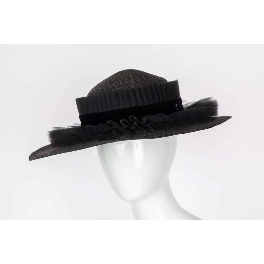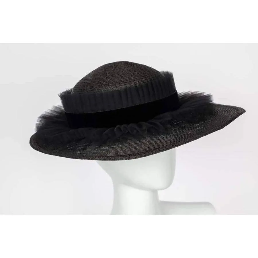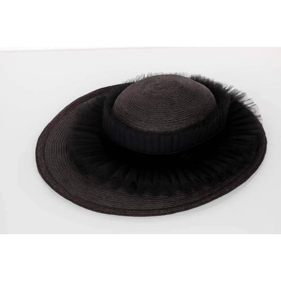 - Silk mesh around crown has figure eight ruffles attached to the hat for an added dramatic effect