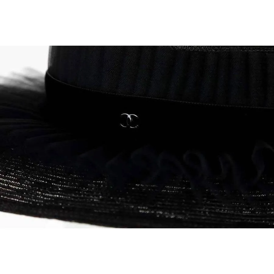 - Vertical ruffles held by a black velvet ribbon on left side CC logo is in silver