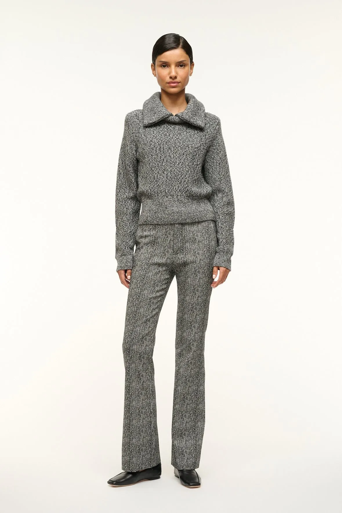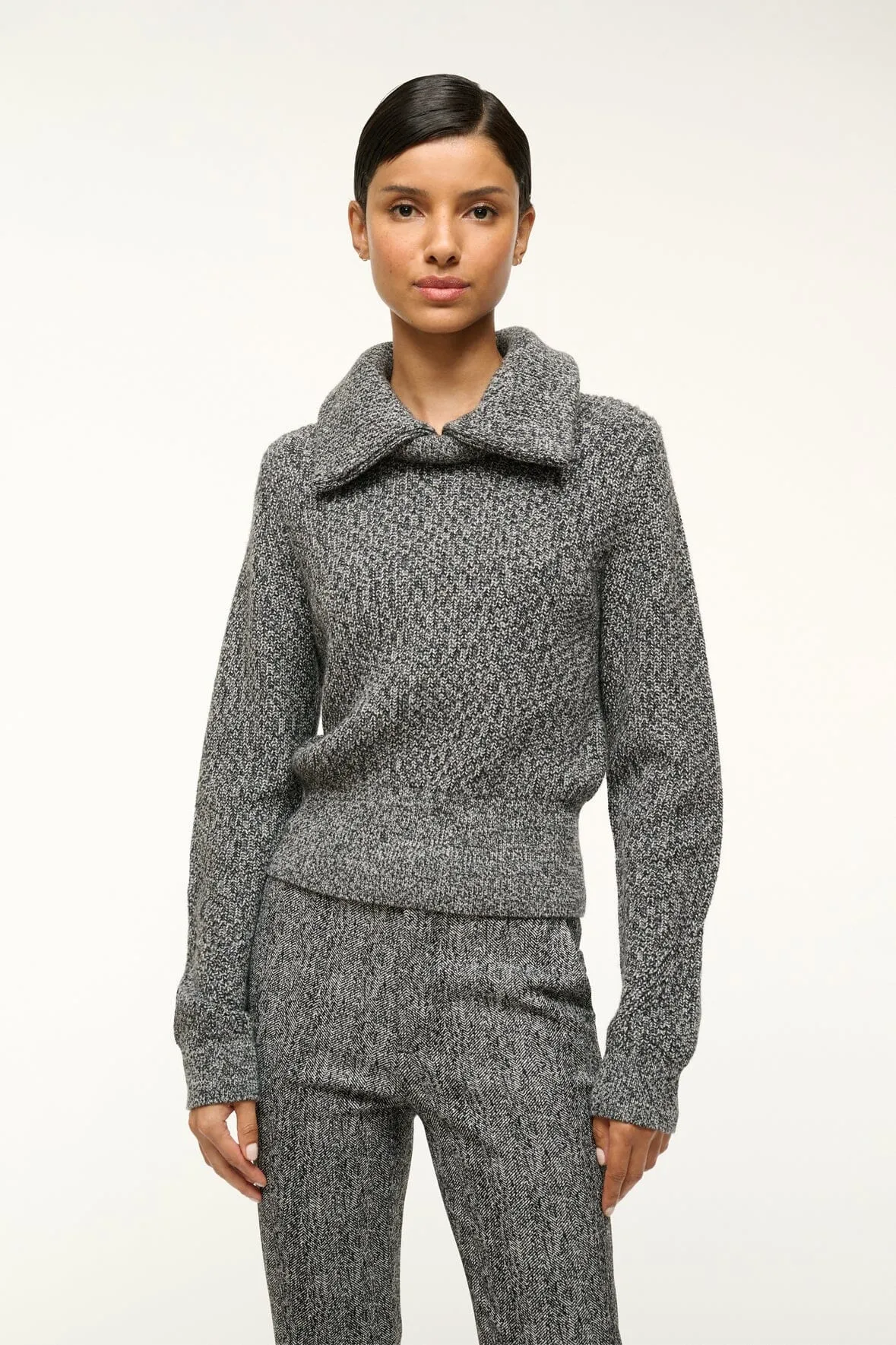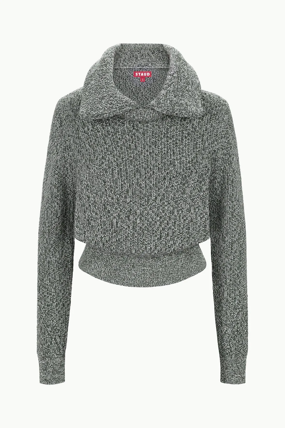 The Christopher Sweater is a chunky marled knit sweater with an exaggerated double collar and ribbed cuffs and hem.