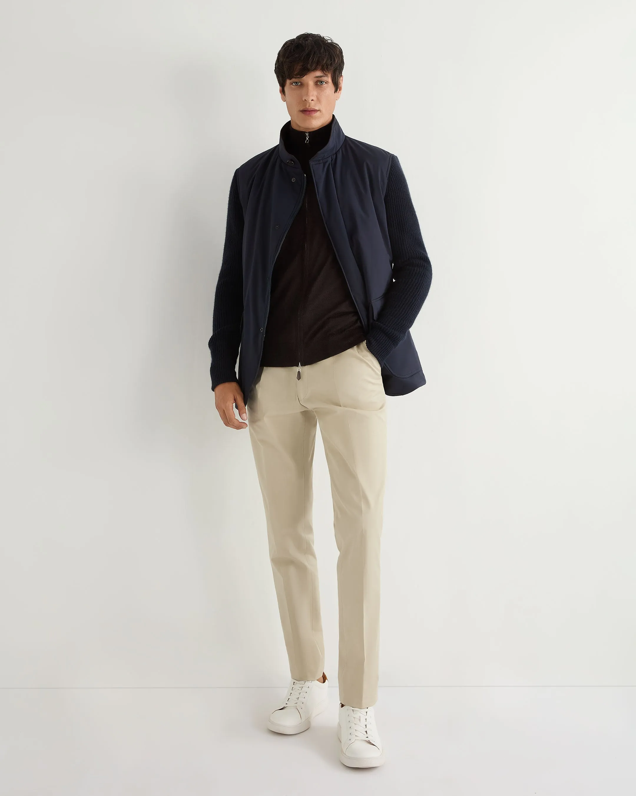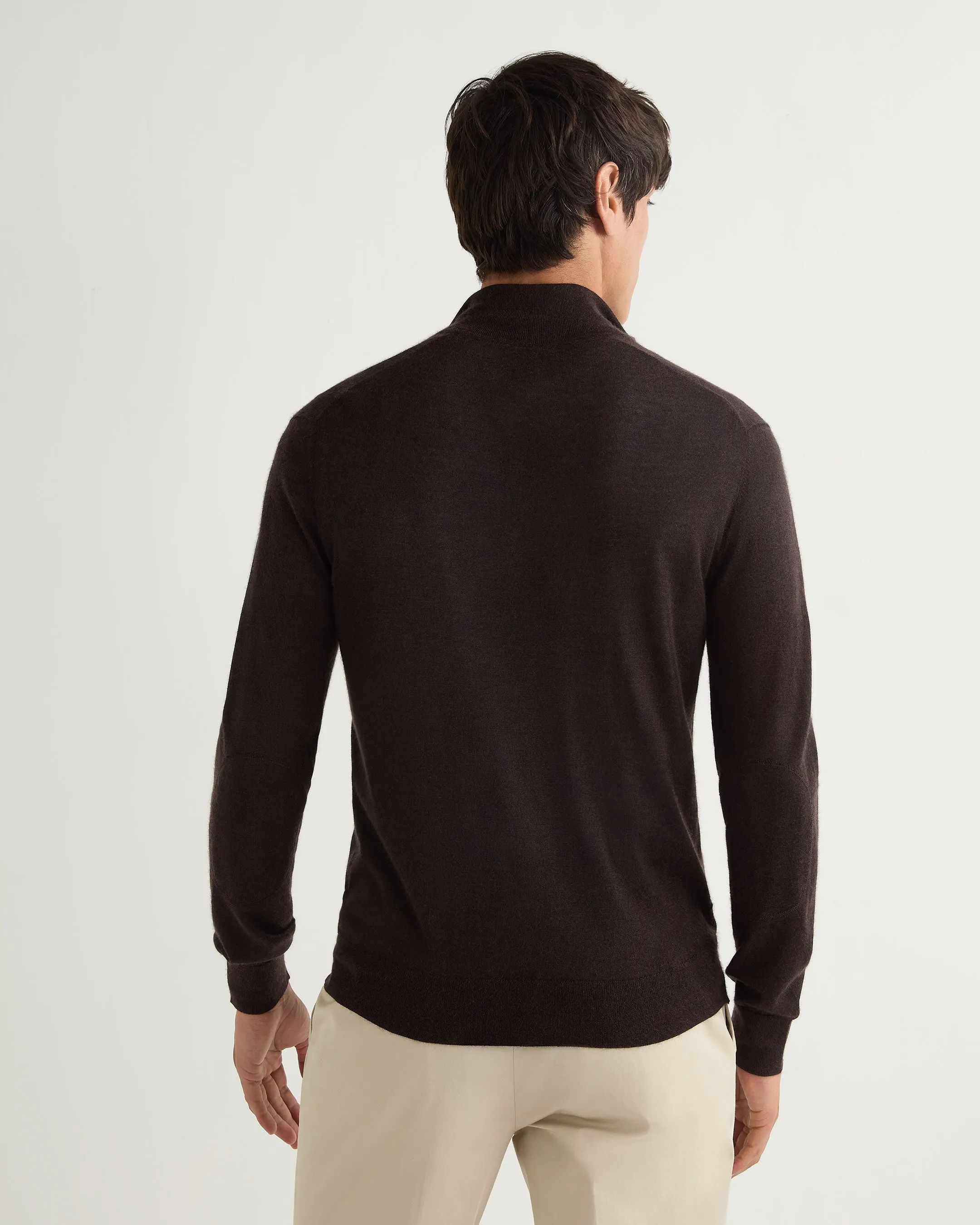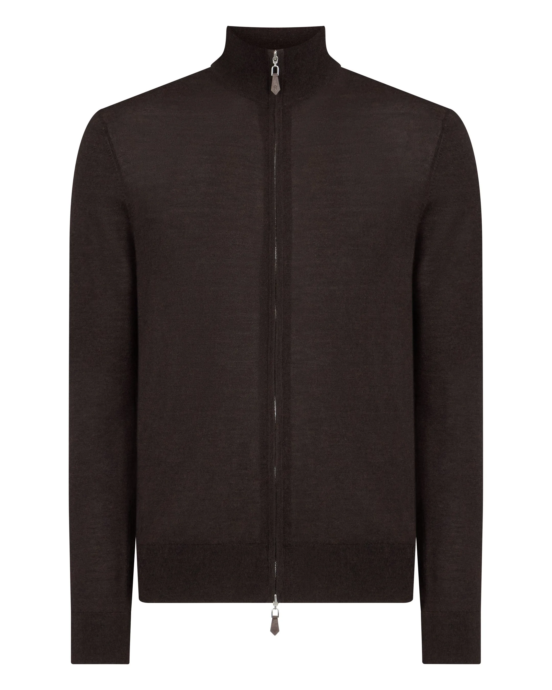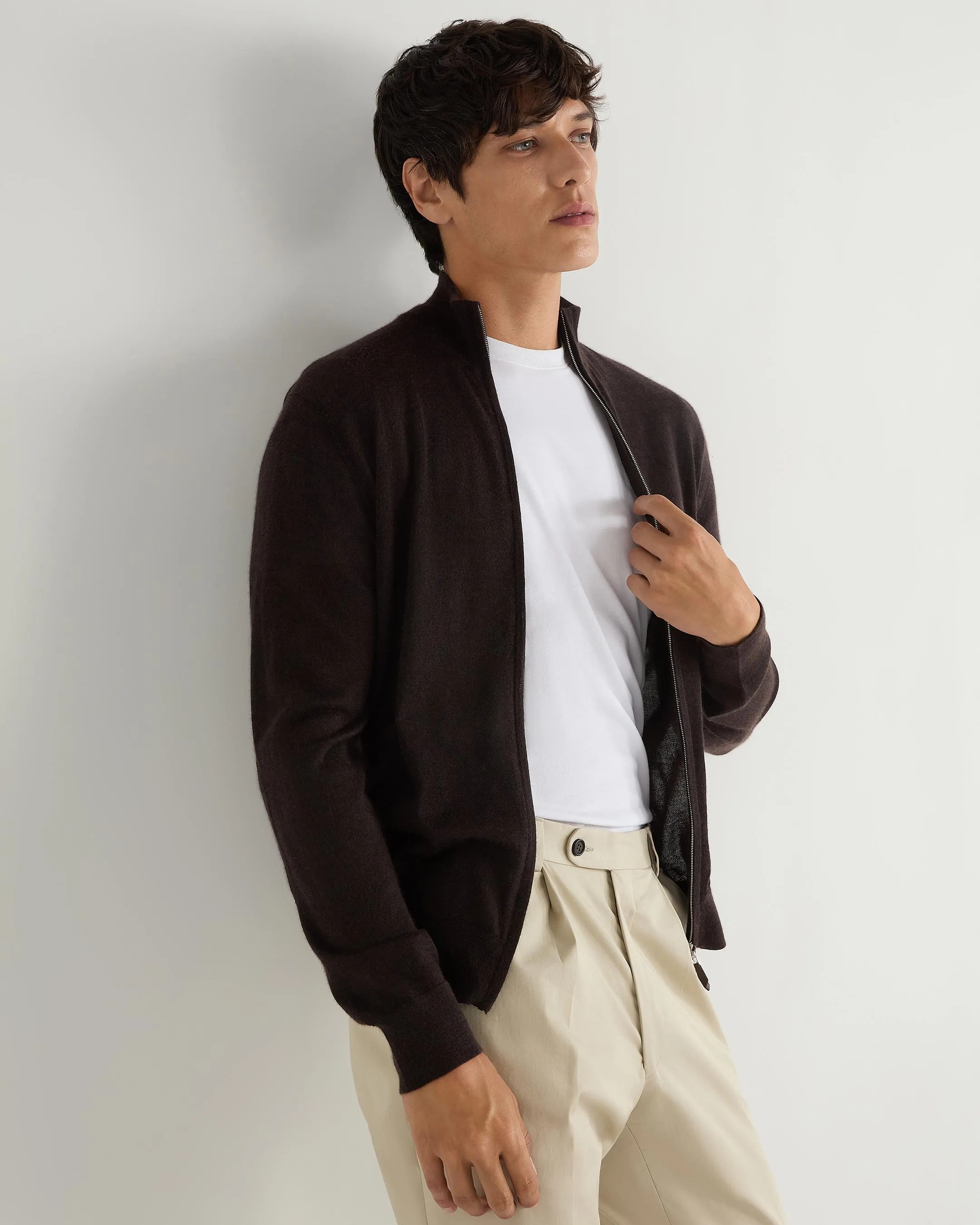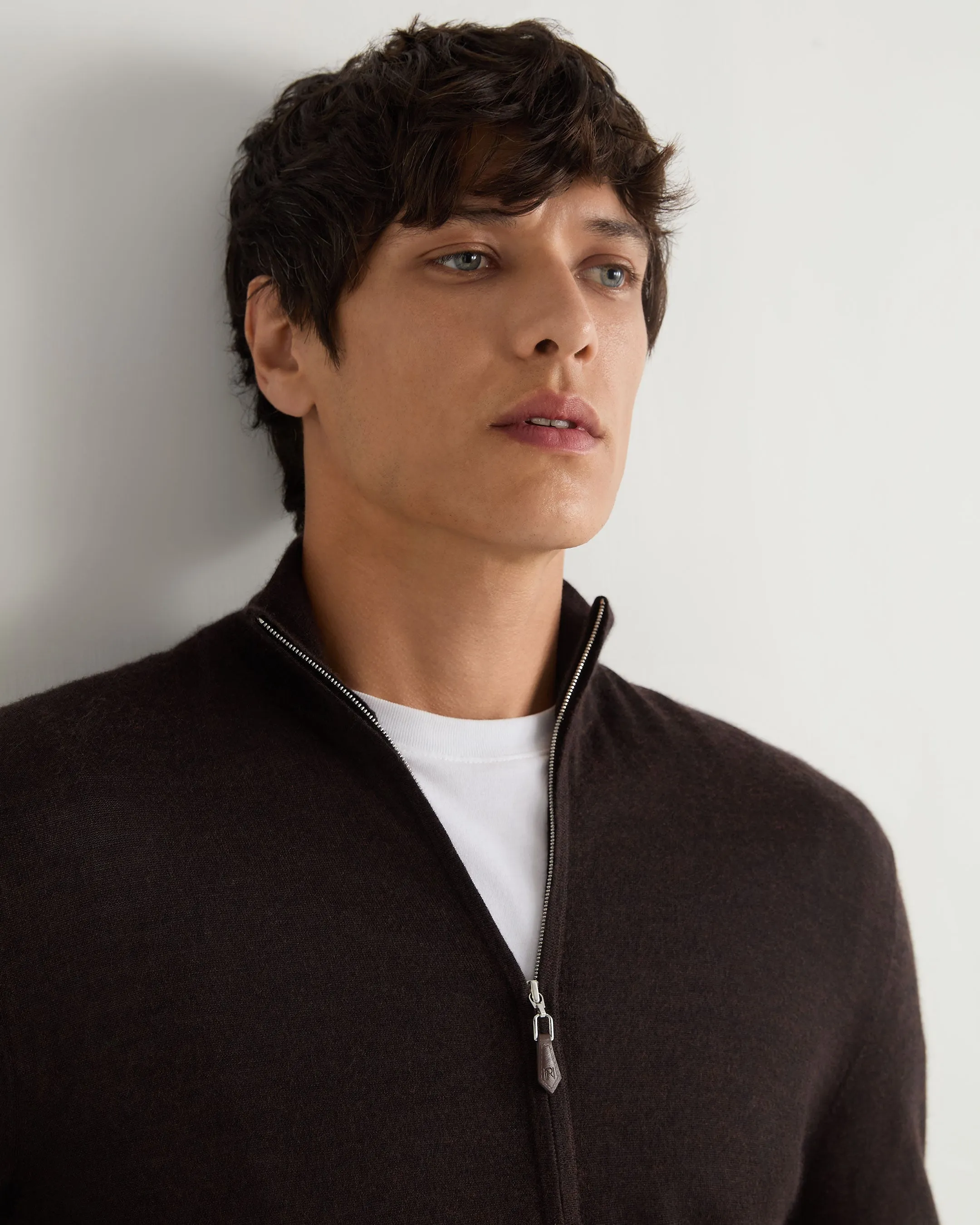 The Hyde is shown here, a fine gauge summer weight zip sweater.