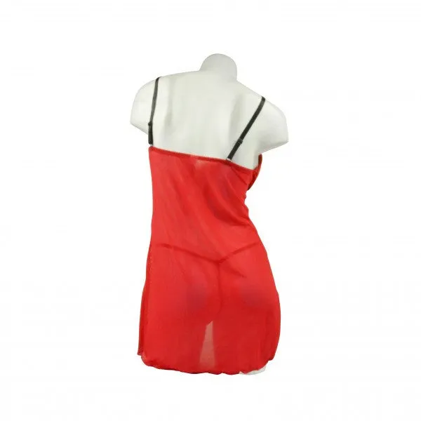 - Overlapping panel red peek-a-boo mesh dress for just a hint of what's beneath