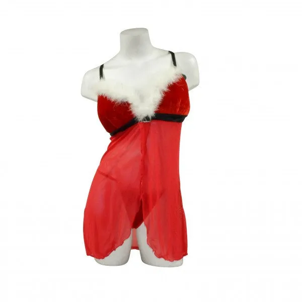 - Lightly padded red velvet cups with white faux fur trim on cups